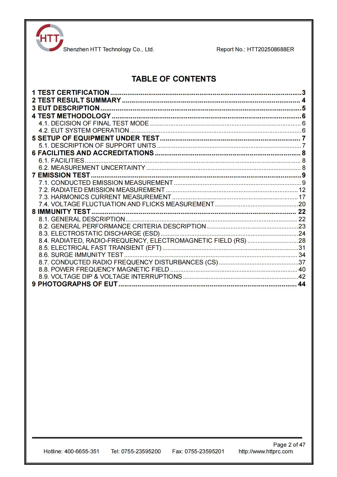 To ensure the authority and credibility of the test results, HTT uses world-class test equipment and venues. The test instruments include R&S ESCI EMI Test Receiver, AFJ LS16 Line Impedance Stabilization Network (LISN), Maconi 2022D Signal Generator, etc. All equipment has undergone professional calibration on May 21, 2025, and is traceable to the International System of Units (SI), with the calibration cycle strictly controlled within 12 months. The test venue complies with ANSI C63.4 and CISPR Publication 14 standards. Among them, the fully anechoic chamber provides an interference-free environment for radiated emission and immunity tests. Configurations such as the ground reference plane and coupling/decoupling network all meet international test specifications, making each set of data traceable and convincing.