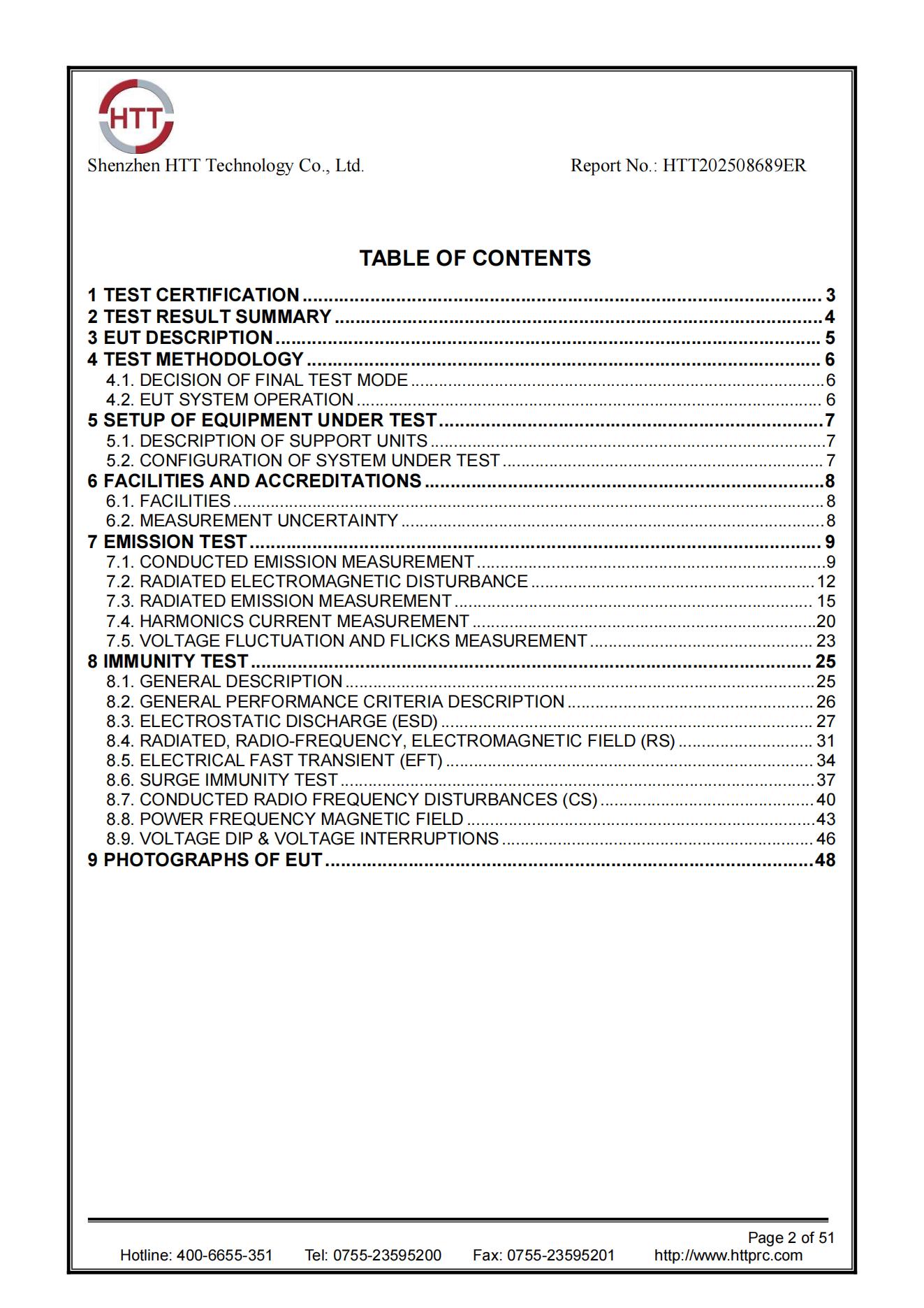To ensure the authority and credibility of the test results, HTT Laboratory uses world-class test equipment and venues. The test instruments include R&S ESCI EMI Test Receiver, EVERFINE LLA-2 Triple-Loop Antenna, Maconi 2022D Signal Generator, etc. All equipment has undergone professional calibration on May 21, 2025, and is traceable to the International System of Units (SI), with the calibration cycle strictly controlled within 12 months. The test venue complies with ANSI C63.4 and CISPR Publication 15 standards. Configurations such as fully anechoic chamber, ground reference plane, and coupling/decoupling network all meet international test specifications, ensuring the accuracy and traceability of each set of data.