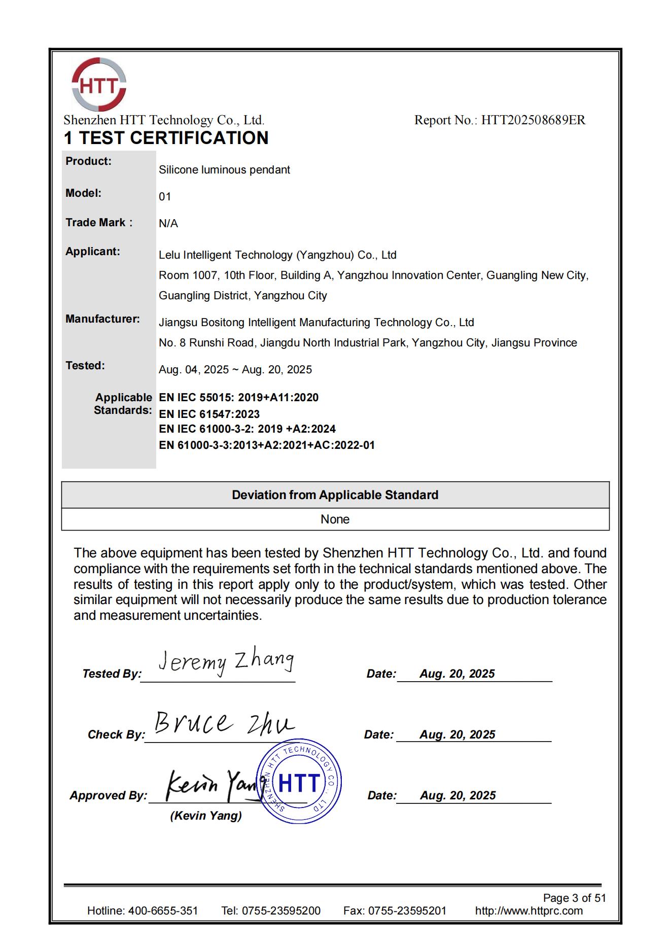 Recently, the Model 01 Silicone Luminous Pendant, exquisitely manufactured by Jiangsu Bositong Intelligent Manufacturing Technology Co., Ltd. and led by Lelu Intelligent Technology (Yangzhou) Co., Ltd. for application, has successfully passed the rigorous comprehensive EU Electromagnetic Compatibility (EMC) test conducted by Shenzhen HTT Technology Co., Ltd. (hereinafter referred to as "HTT"). It has been awarded the authoritative test report numbered HTT202508689ER. This certification covering all dimensions of electromagnetic emission and immunity not only confirms the product's outstanding quality and technical strength but also serves as a "pass" to unlock the global high-end consumer market, injecting strong momentum into the export of fashion accessory products.